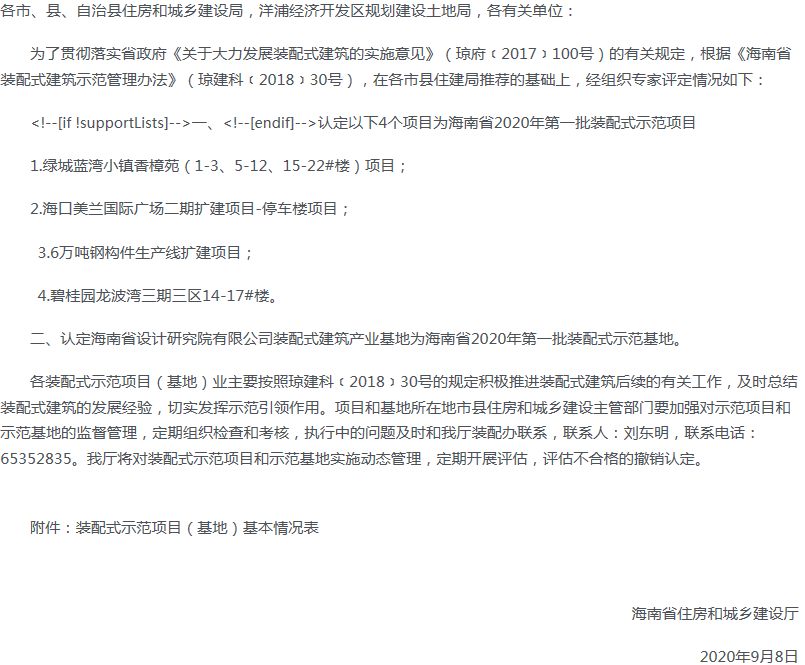海南省住房和城鄉(xiāng)建設廳 關于認定海南省2020年第一批裝配式示范項目和示范基地的通知